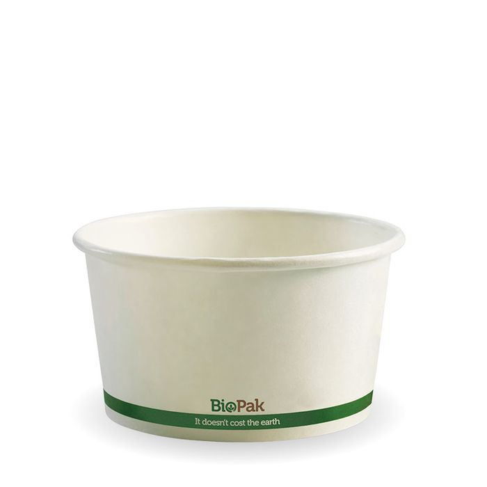 12oz white paper bowls are lined with a plant-based bioplastic, not fossil-fuel plastic. Certified industrially compostable. Suitable for hot/cold food and soup-safe.