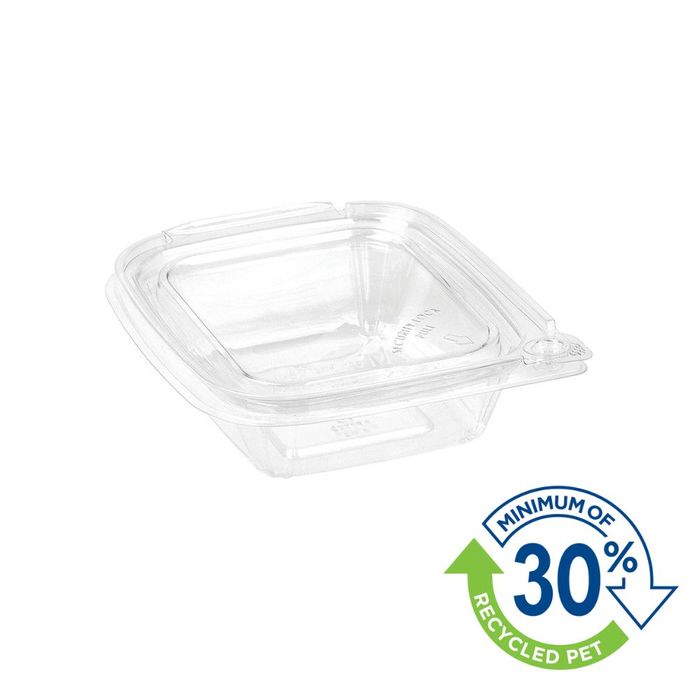 Our range of ECO+StaySafe hinged lid containers makes it easy to control the safety and seal in the freshness of your takeaway food. Thanks to our innovative tamper-proof seal and air-tight closure, making the range is perfect for transporting your food safely to your customers. Made from a minimum of 30% post-consumer recycled RPET the StaySafe range is fully recyclable.