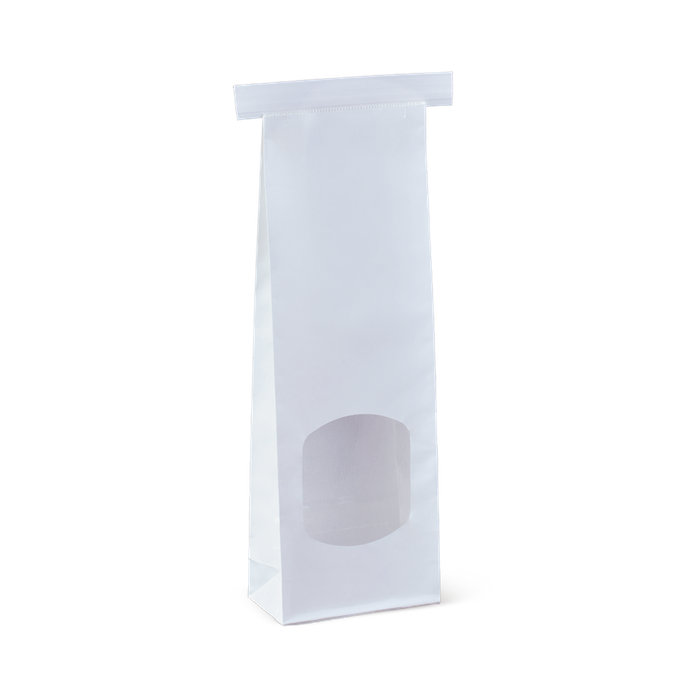 Retail window bags are poly-lined for freshness and feature a window to showcase the contents. They’re ideal for dry foods like coffee beans, loose leaf tea, biscuits, and nuts, and can be sealed with a bar heater. Poly lining is 100% BPA-free. The small tin-tie bag can also be resealed with the tin-tie.