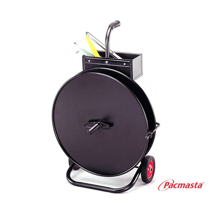 This portable strapping dispenser has a 400mm diameter core ideal for green Polyester Strapping, which is an an alternative to steel strapping. It has wheels and a storage tray that can fit your metal seals or clips and strapping tools. This Dispenser has a break mechanism to prevent the roll of strap from unrolling. This strapping trolley allows for the easy moving of strap to the desired location were you will be strapping in your warehouse.